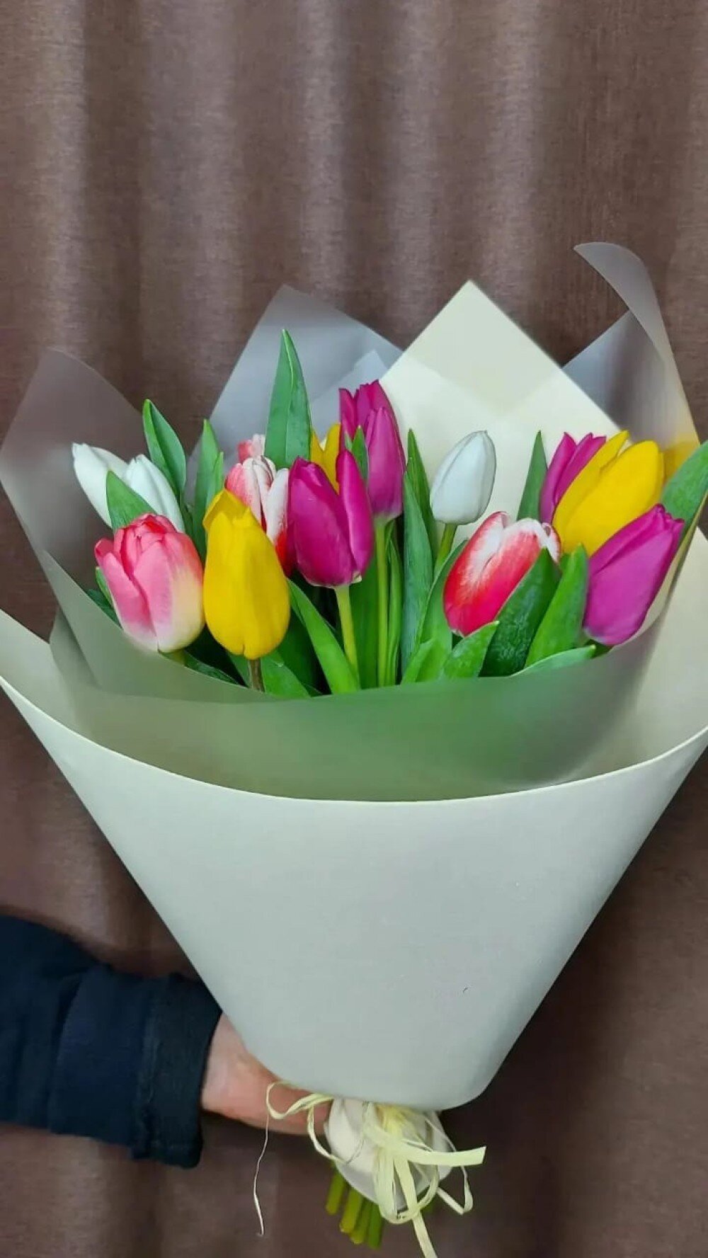 Букет упакован в два упаковки, и перевязан атласной лентой. Состав: Тюльпан - 15 штук Упаковка.