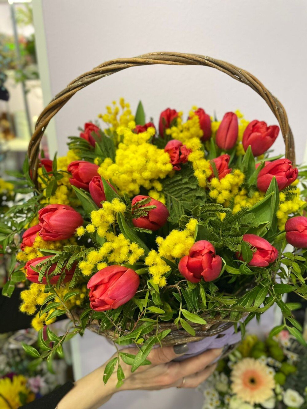 В корзинке стоит специальная губка пропитанная водой Состав: Тюльпан - 21 штука Солидаго - 5 штук Корзинка - 1 штука Фисташка - 5 штук Пиафлор.